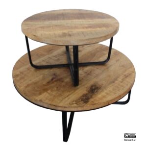 Ronde salontafelset van twee met een 3 cm dik mangohouten blad. Deze salontafels zijn voorzien van een stalen onderstel in het zwart. Deze set van twee zijn deels onder elkaar te schuiven.