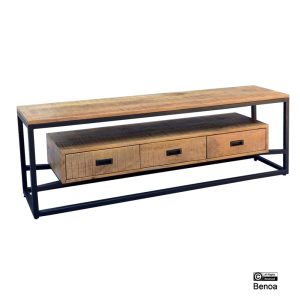 Deze TV-meubel is gemaakt van mangohout en staal. De Len TV-meubel is voorzien van drie laden met fraaie handgrepen en een open ruimte voor eventuele apparatuur. De Len collectie heeft een ruimtelijk design dat niet snel vergeten wordt. Het staal is zwart gepoedercoat wat een mooi mat effect heeft op het metaal en waardoor de kwaliteit gewaarborgd blijft.