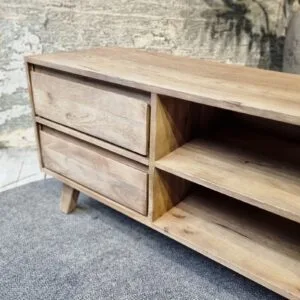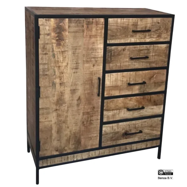 Kast met vijf laden en één deur met daarachter legplanken. Een schitterende kast waar veel spullen in opgeborgen kunnen worden. Het behoort tot de GB collectie, dat wordt gekenmerkt door haar gebalanceerde combinatie van mangohout en staal. Het straalt rust uit en vormt een goede basis voor het interieur.