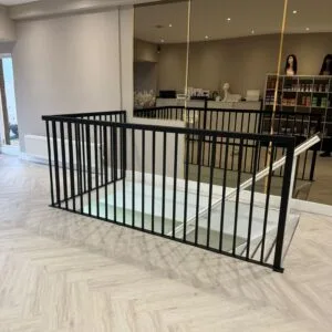 Zowel binnen- als buitentrappen kunnen worden uitgerust met gepoedercoate balustrades, die veiligheid bieden en tegelijkertijd een strakke uitstraling hebben. - Zwembaden